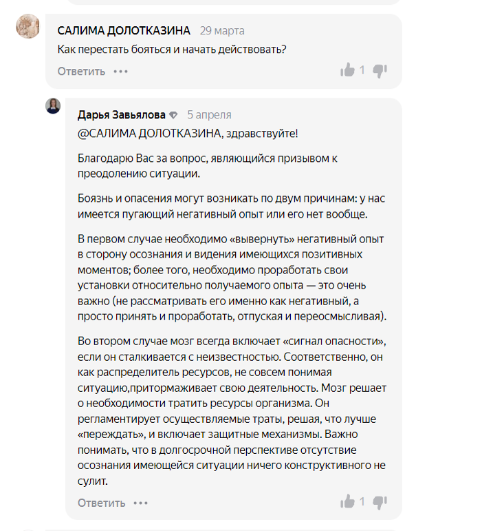 На вопрос о том, как перестать бояться и начать действовать, Дарья Владимировна дала развернутый ответ, часть которого: